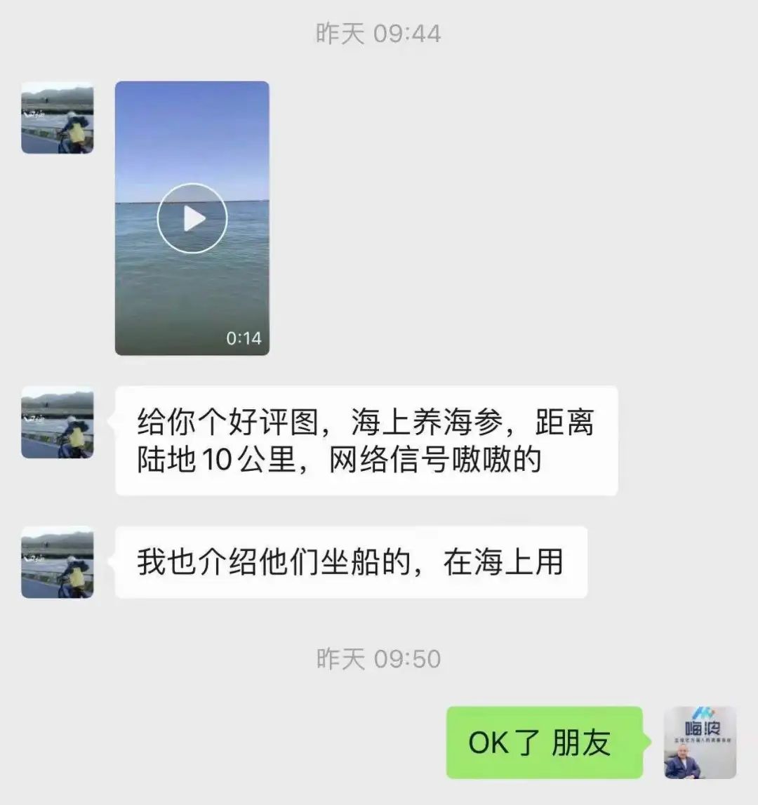 有海上作业的用户反馈,嗨浪在海上表现太棒了!即使距离陆地10公里,网络信号依然嗷嗷的!