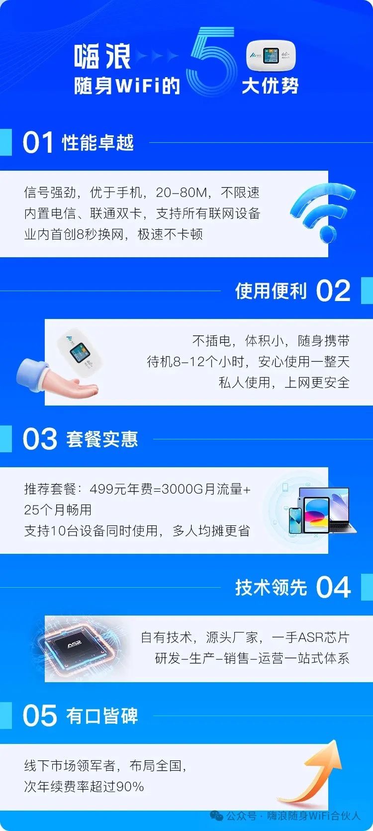 在这个流量为王的时代,嗨浪随身 WiFi 凭借其卓越的产品优势、广阔的市场前景和强大的加盟支持,为用户带来了流量自由的便捷体验,为合伙人提供了实现财富自由的优质平台。无论是想摆脱上网困扰的用户,还是寻找创业商机的有志之士,嗨浪随身 WiFi 都是不二之选。加入嗨浪,与时代共进,开启流量自由新时代,共创辉煌未来!